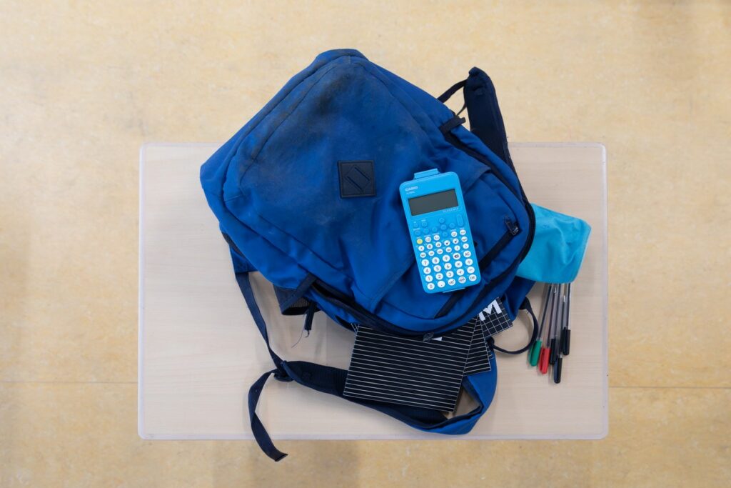 In die rugtas zitten pennen, schriften, een rekenmachine en nog veel meer belangrijke schoolspullen die elke brugklasser nodig heeft voor een goede start.